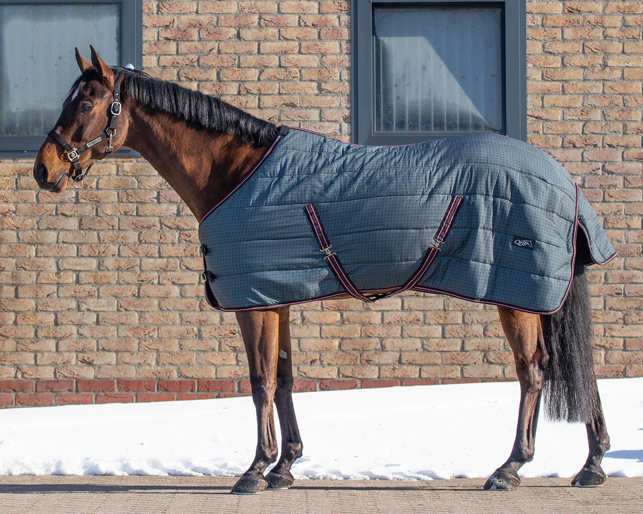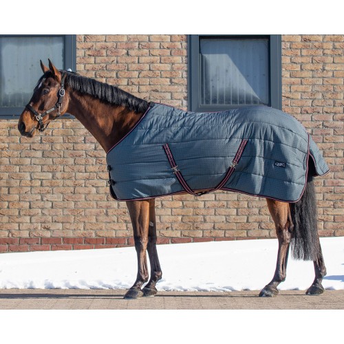 La couverture d'écurie en nylon est spécialement conçu pour une utilisation dans l'écurie. Elle est plus respirante qu'une couverture d'extérieur et garde le cheval au chaud lorsqu'il fait froid ou qu'il y a des courants d'air. Elle est également indispensable lorsque le cheval est tondu. Specifications Tissu extérieur: 100% polyester Tissu intérieur: 65% polyester, 35% coton Garnissage en tissu: 100% polyester Fait de polyester 210D Equipé d'un remplissage de 200 grammes Cette couverture est fait d'un tissu respirant Équipée d'une double fermeture à boucle avant Quincaillerie en acier inoxydable argenté