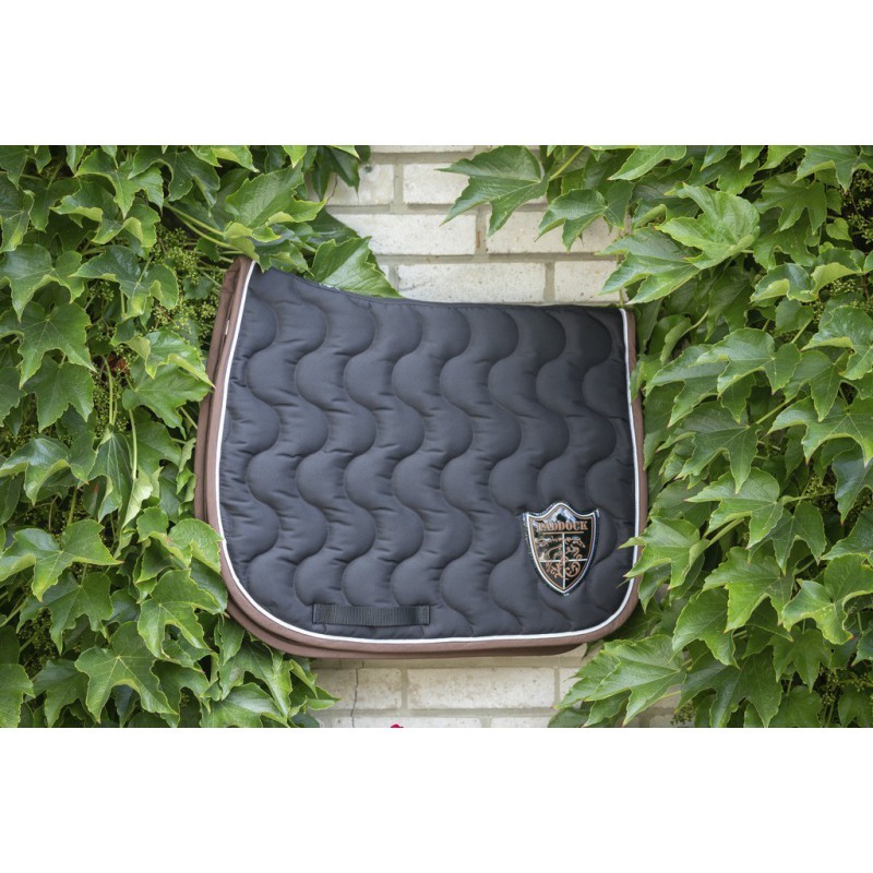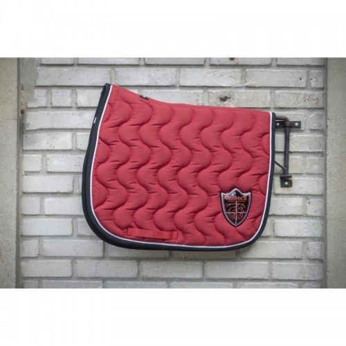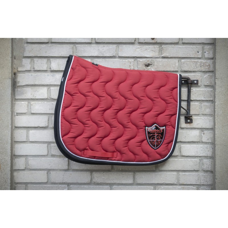 Tapis de selle fabriqué en France doublé en coton nid d'abeille. Le motif est en forme de vague à la verticale. La forme permet de bien dégarrotter le tapis et la selle. Il y a un passant de sange de chaque côté du tapis. Le tapis est composé de deux épaisseurs de mousse différentes, et d'un tissu en nid d'abeille au contact de la peau du cheval pour une meilleure évacuation de la transpiration. Il y a un écusson du coté gauche du tapis assorti aux coloris du tapis.