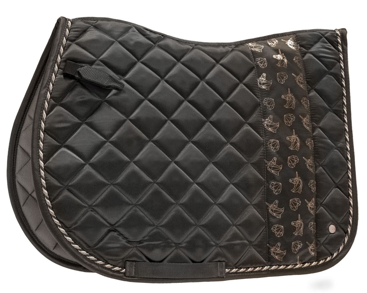 Composition du tissu à l'endroit : 100% polyester Composition du tissu à l'intérieur : 100% polyester Remplissage : 1 cm mousse + 250 gr fibre polyester Adorable tapis de selle avec des imprimés dorés sur les deux côtés Couture en motif décoratif ondulé Muni d'une corde décorative en deux tons sur le bord Décoré par un Q-pin sur le côté gauche Doublée d'un mesh absorbant qui absorbe bien la transpiration