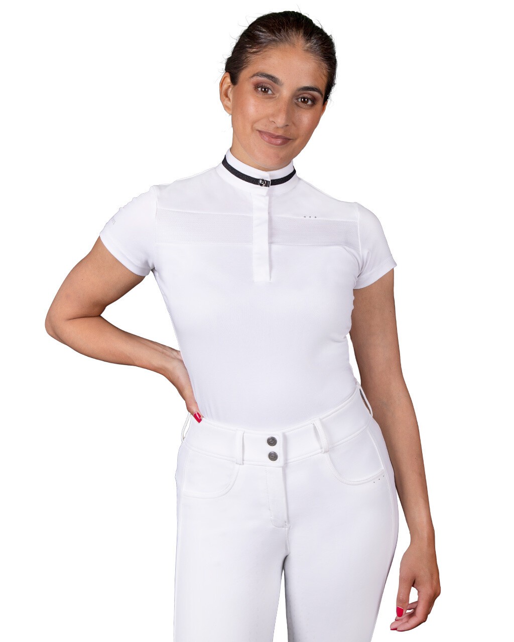 La chemise de compétition Kae est une chemise à séchage rapide et évacuant l'humidité. Cette chemise est confortable grâce à son tissu élastique et possède une belle bande pailletée sur le col. Le modèle en photo mesure 172 cm et porte la taille 36. Spécifications Composition du tissu : 90% polyester, 10% élasthanne Chemise de concours à manches courtes Fait dans un tissu respirant et qui ne garde pas l'humidité Le col est fini par une bande brillante et le pin's Q Lavable à la machine à 30 degrés. De préférence ne pas utiliser d'adoucissant ni de sèche-linge Fait partie de la collection Kae
