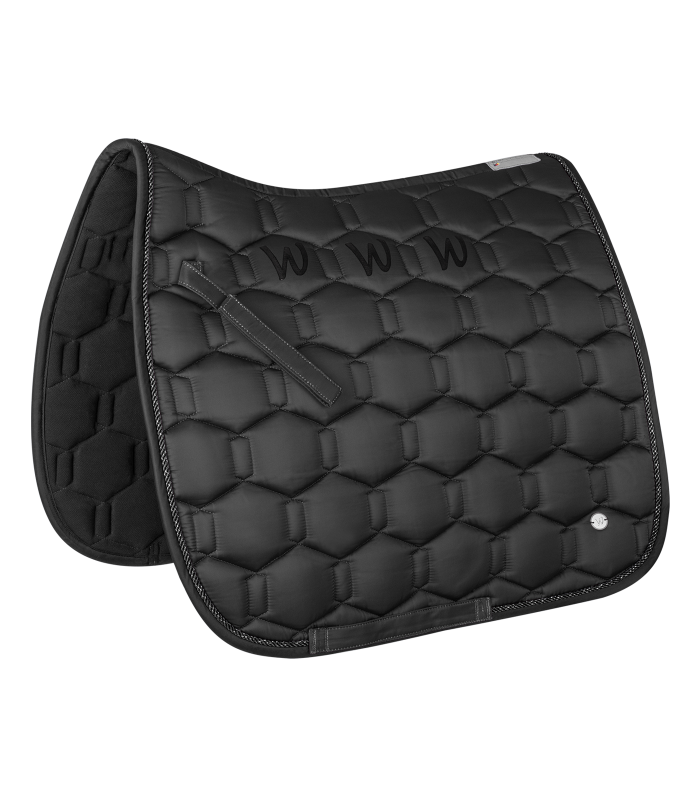 Chabraque de grande qualité avec matière extérieure brillante. Le logo métallique argenté et le cordon scintillant attirent plus encore les regards sur cette chabraque. Les trois applications en silicone placées sous la selle l’empêchent de glisser. Le contre-sanglon peut être sélectionné, au choix, dans une variante simple ou scindée.